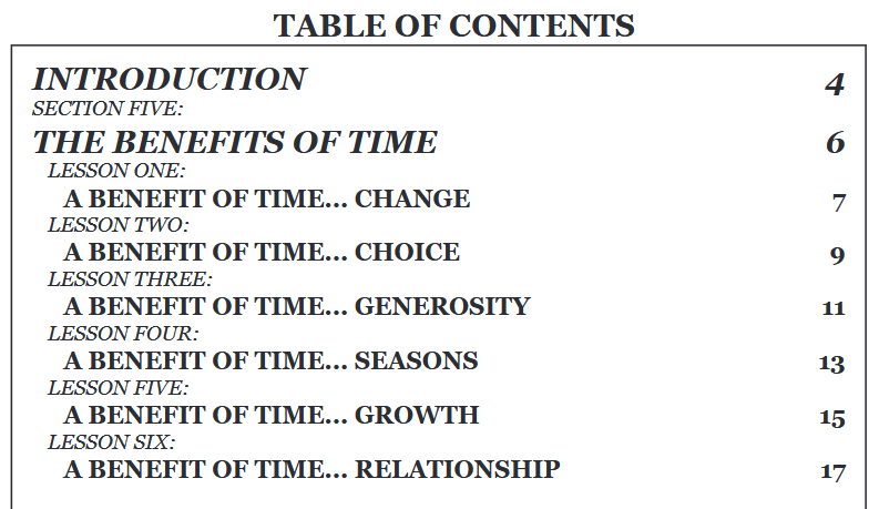 I just completed Section 5, which would be week 5 of the curriculum. This weeks section was about “The Benefits Of Time”.