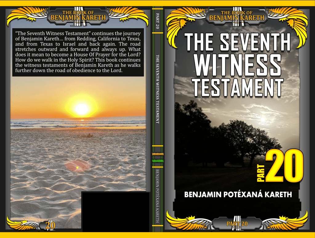 “The Seventh Witness Testament” continues the journey of Benjamin Kareth… from Redding, California to Texas, and from Texas to Israel and back again. The road stretches outward and forward and always up. What does it mean to become a House Of Prayer for the Lord? How do we walk in the Holy Spirit? This book continues the witness testaments of Benjamin Kareth as he walks further down the road of obedience to the Lord.