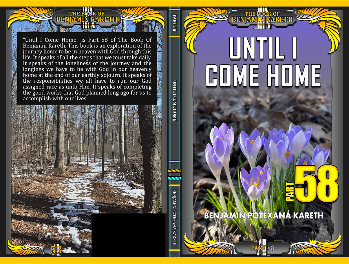 Book Description: “Until I Come Home” is Part 58 of The Book Of Benjamin Kareth. This book is an exploration of the journey home to be in heaven with God through this life. It speaks of all the steps that we must take daily. It speaks of the loneliness of the journey and the longings we have to be with God in our heavenly home at the end of our earthly sojourn. It speaks of the responsibilities we all have to run our God assigned race as unto Him. It speaks of completing the good works that God planned long ago for us to accomplish with our lives.