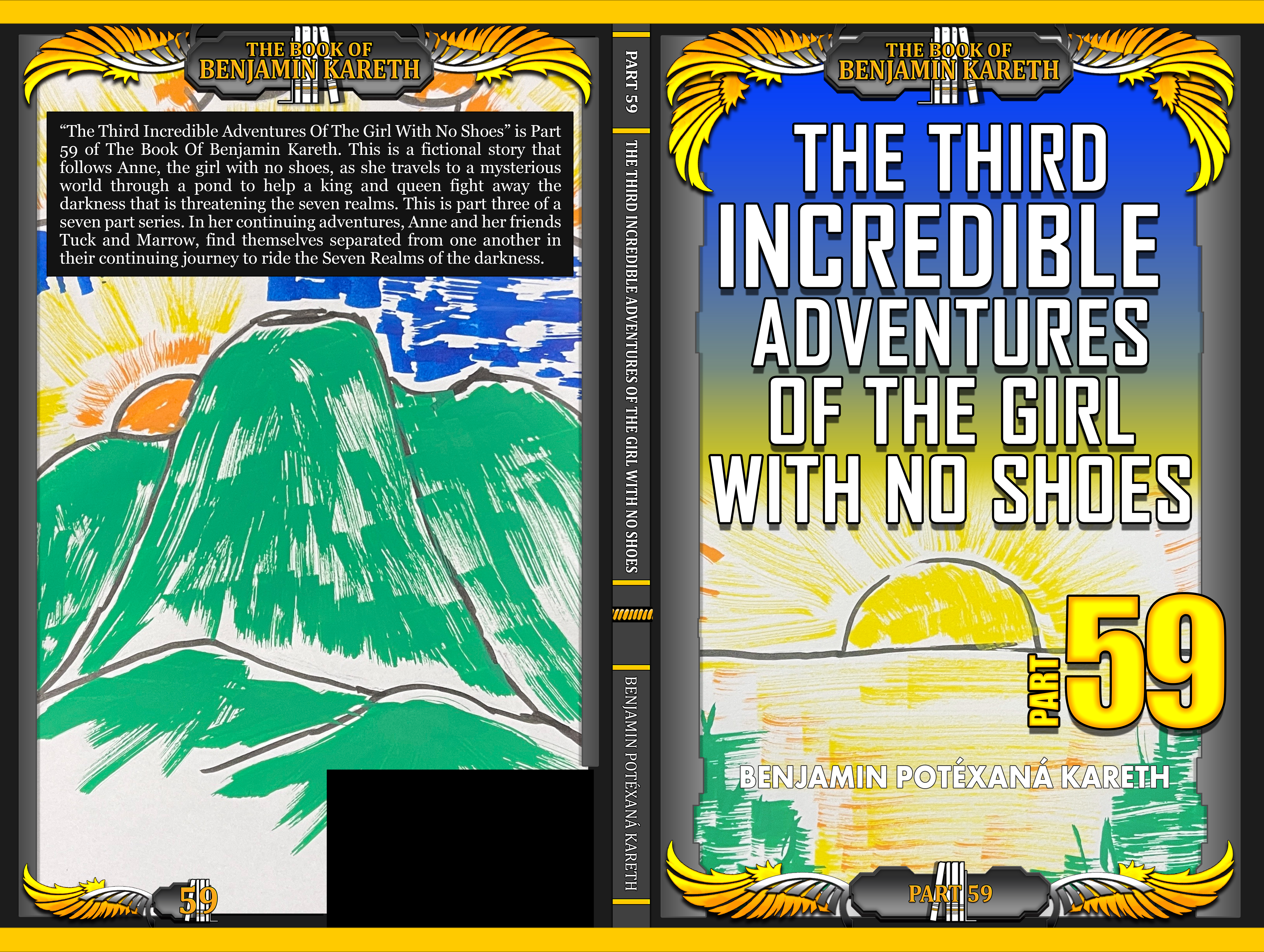 BOOK DESCRIPTION: “The Third Incredible Adventures Of The Girl With No Shoes” is Part 59 of The Book Of Benjamin Kareth. This is a fictional story that follows Anne, the girl with no shoes, as she travels to a mysterious world through a pond to help a king and queen fight away the darkness that is threatening the seven realms. This is part three of a seven part series. In her continuing adventures, Anne and her friends Tuck and Marrow, find themselves separated from one another in their continuing journey to rid the Seven Realms of the darkness.