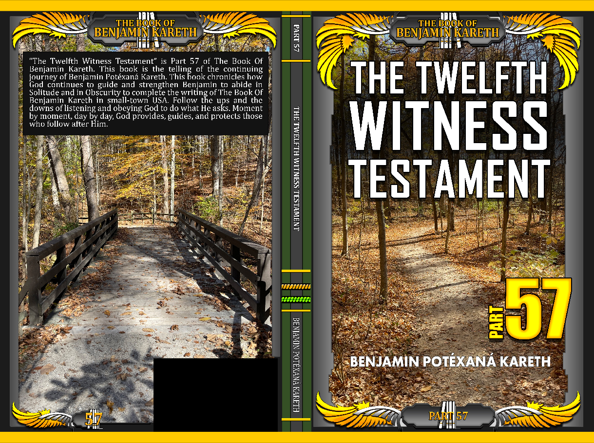 Book Description: “The Twelfth Witness Testament” is Part 57 of The Book Of Benjamin Kareth. This book is the telling of the continuing journey of Benjamin Potéxaná Kareth. This book chronicles how God continues to guide and strengthen Benjamin to abide in Solitude and in Obscurity to complete the writing of The Book Of Benjamin Kareth in small-town USA. Follow the ups and the downs of listening and obeying God to do what He asks. Moment by moment, day by day, God provides, guides, and protects those who follow after Him.